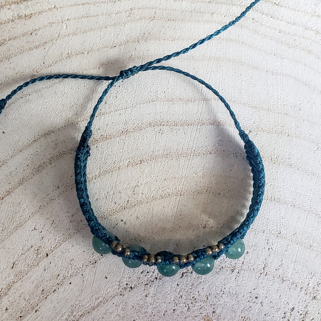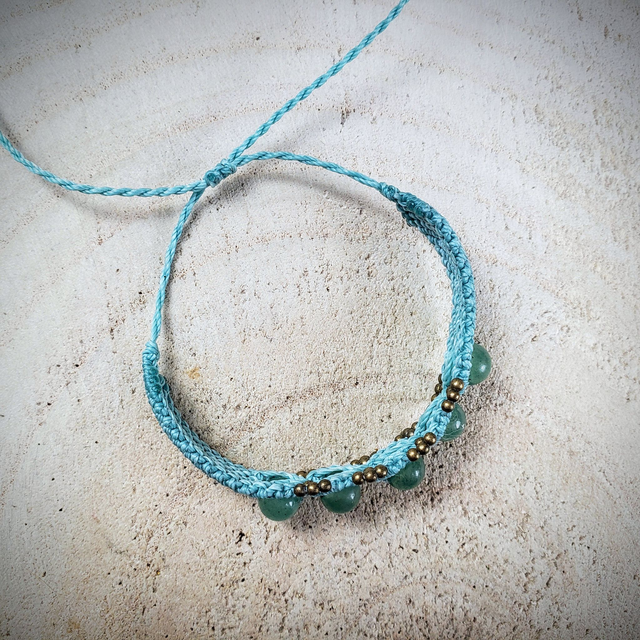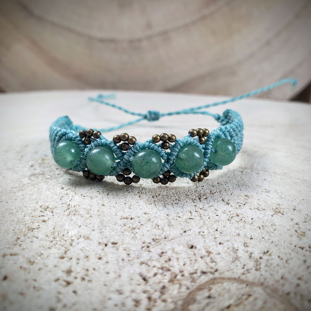 Bracelet large, ajustable (30 cm) orné de pierres d'aventurine et de petites perles en laiton.