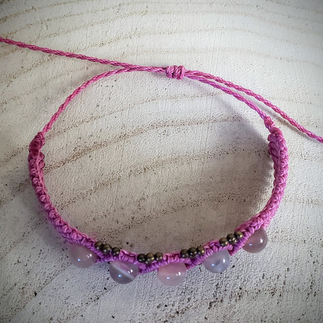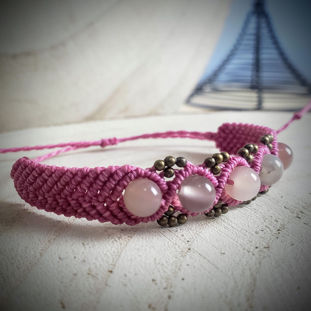 Bracelet large, ajustable (30 cm) orné de pierres de lune, et de petites perles en laiton.