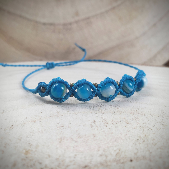 Bracelet entrelacé, ajustable, orné de pierres d'agate bleue et de perles en laiton.