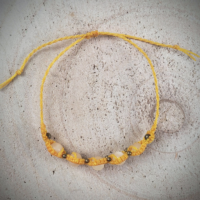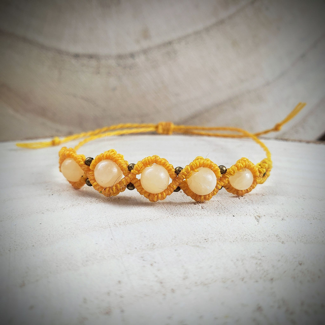 Bracelet entrelacé, ajustable, orné de pierres de calcite jaune et de perles en laiton.