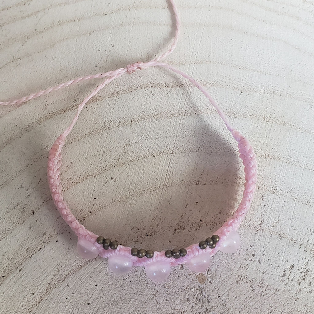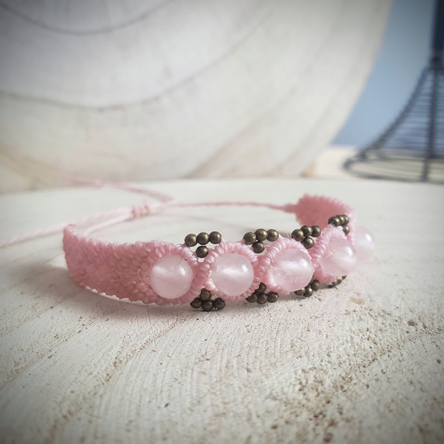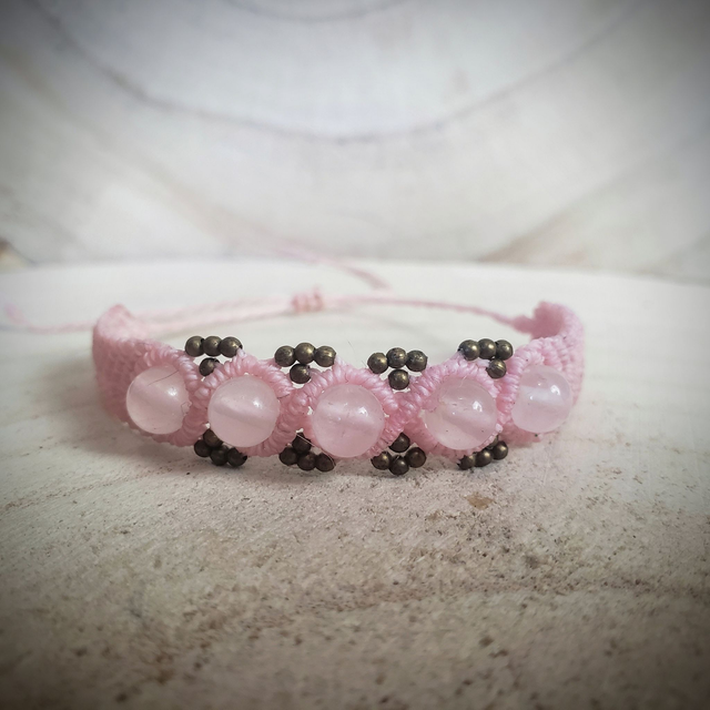 Bracelet large, ajustable (30 cm) orné de pierres de quartz rose et de petites perles en laiton.