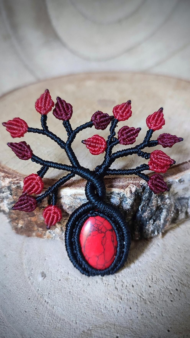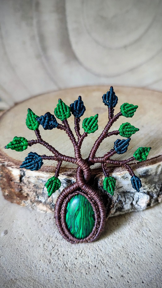 Arbre de vie réalisé à partir d'une pierre naturelle (oeil de tigre, jaspe rouge, malachite) ornée d'un tissage en macramé nuancé de diverses couleurs